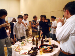 ビールやお酒、たくさんのおいしい料理を楽しみ、会場のあちこちで会話に花が咲き楽しそうな笑い声が響きました。 |