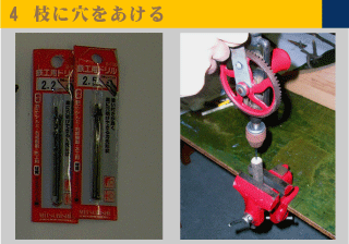 枝を万力で机などに固定し、先端をのこぎりで切り落としてからハンドドリルで穴をあけます。