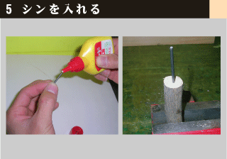 ②で取り出しておいたシンに少し木工用ボンドをつけて、穴の中にいれます。